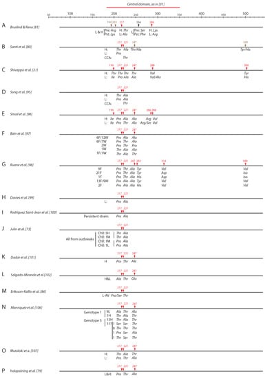 Smail et al. [] reported a study also working with Sp strains, in this case isolated from the Shetlands (from outbreaks: high virulence) and Scotland (from asymptomatic carrier fish: low virulence). The results, summarized in Figure 6E, showed that the positions with changes between L and H strains coincided with those of previous reports [,] but the virulence determinants were completely different. In fact, using the determinants proposed by Song et al. [], the H Shetland strains should be of low virulence. They concluded that the interaction between the viral strains, the fish species and even the geographic origin could be quite complex and therefore “it may be premature to define certain residues as vital determinants”.