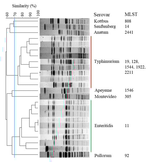 When the genomic DNA of all Salmonella isolates was digested with the XbaI enzyme and separated by PFGE, the DNA fragments had a good separation, giving 11 to 19 bands per isolate. The 103 Salmonella isolates were successfully assigned into 8 groups representing different serotypes. The genetic similarity among these groups was lower than 70% (Figure 1).