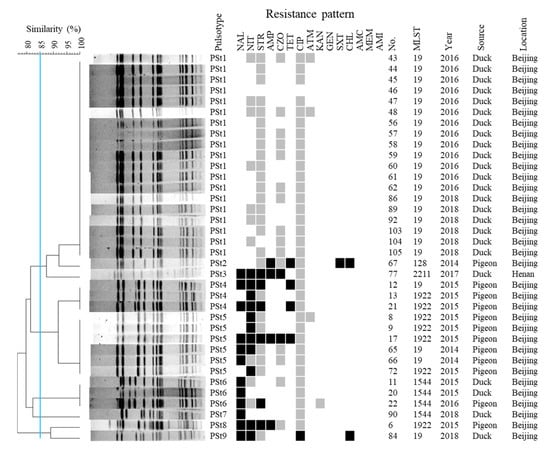 In this study, the majority of S. Typhimurium isolates were grouped into ST19 (63.89%), the most common sequence types isolated from humans and animal-based food products across the world [,]. Moreover, ST128, ST1544 and ST2211 have been identified from human and animal samples in China and the United Kingdom [,]. Perhaps circulatory transmission generated between contaminated poultry meat and human beings. Interestingly, the ST1922 in our collection consisted of seven isolates originating exclusively from diseased pigeons. A previous study has revealed that ST1922 Typhimurium was originally isolated from liver of pigeon sold in one market in Sanya, China []. To our knowledge, ST1922 of Typhimurium has been specifically isolated from pigeon samples until now. Further analysis may be needed to explore the restrictive relationship between the ST type and pigeon host. Besides, other ST types of Typhimurium were also recovered from meat of pigeon recently []. Using PFGE subtyping the 36 Typhimurium isolates were classified into five subtypes with a < 85% similarity (Figure 3). Most of the duck- and pigeon-origin Typhimurium isolates were distributed in subtype 1 and subtype 2, respectively, suggesting some association between PFGE and host-origin. On the other hand, 19 S. Typhimurium isolates shared identical PFGE patterns in PSt1, suggesting the circulation of clonality among the S. Typhimurium in the local duck farms.