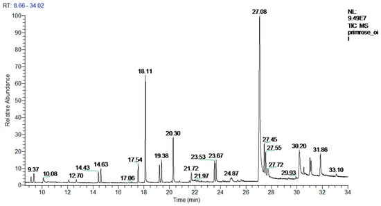 Total ion chromatogram obtained by GC–MS analysis of evening primrose oil.