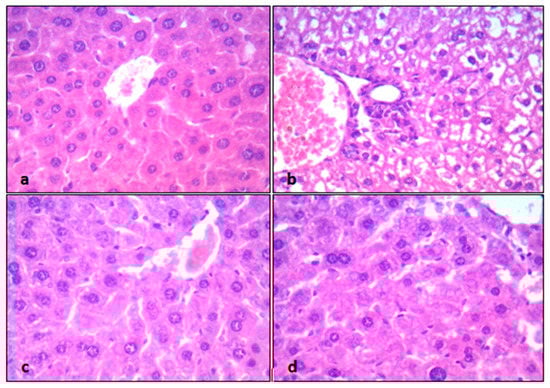 The protective effect of different doses of EPO on hepatic histopathology, induced by cyclophosphamide: (a) Control mice, (b) CP-intoxicated mice, (c) CP + EPO 5 mg/kg/day mice, and (d) CP + EPO 10 mg/kg/day mice. All sections captured at 400× magnification, using objective 40×, UIS optical system (Universal Infinity System, Olympus®, Tokyo, Japan).