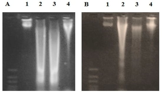 Horizontal gel electrophoresis of genomic DNA extracted from (A) liver, and (B) pancreas of experimental mice. Lane (1): Control mice. Lane (2): CP-intoxicated mice. Lane (3): CP + EPO (5 mg/kg/day). Lane (4): CP + EPO (10 mg/kg/day).