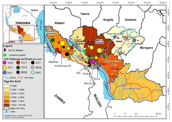 In the Southern Highlands, between 2010 and 2011, outbreaks of ASF were first reported in Kyela district of Mbeya region, which shares international boundaries with Malawi. Legal and illegal trades of livestock occur across the borders and may have facilitated the introduction and transmission. These outbreaks spread inwards and covered seven districts of Mbeya region (Rungwe, Ileje, Mbarali, Mbeya Rural, Chunya, Mbozi and the City of Mbeya), and in other districts including but not limited to Temeke, Ilala, and Kinondoni municipalities of Dar es Salaam. Details are available in previous reports [] (Figure 1 and Figure 2). Chunya district had reported outbreaks in 2011, 2012, 2014, 2017 and recently in 2019 (Figure 1 and Figure 2). Mbeya district first had outbreaks in early 2017, and again in November/December 2017. These outbreaks coincided with peaks of rains in the districts and because the district has a major livestock market (Pig Market) in Chang’ombe village, which serves pig farmers from other districts, outbreaks in the district were likely disseminated to other districts inadvertently by long-distant transportation and pig trades (Figure 1 and Figure 2).