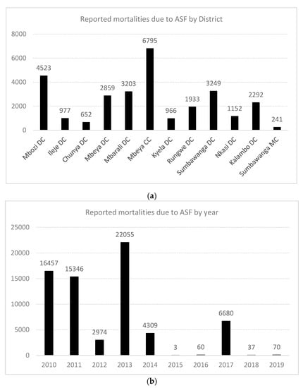 (a) Graphical representation of outbreaks of African swine fever (ASF) in the Southern Highlands, Tanzania, by numbers of reported pig deaths; (b) Reported pig deaths directly attributable to ASF outbreaks in Tanzania by year, 2010–2019. Note: DC = district council; MC = municipal council.