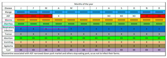 In the identified but complex calendars (Figure 3 and Figure 4), during the massive sale off of pigs due to fear of ASF, traders and middlemen took undue advantage of oversupplies and crash pig/pork prices; farmers, who were in dire needs of money, depended on income from livestock primarily since harvest period for crops are not yet due at this period. In the succeeding months (April–July/August), the survivor/retained piglets and weaners from the previous year are ready for the marketing and high prices supervened due to the scarcity of pigs, based on the demand–supply curve. The ensuing huge traffic of pigs to the livestock markets and abattoir provided ample room for unidirectional movements of pig-associated infections including ASF. It should be understood that the unsold pigs during the high supply period of July–Oct may return to the farms of origin after having had intense interactions and shared environment with pigs from multiple sources, a predisposition to disease outbreaks. In this case, the participatory epidemiology process has become a useful tool in troubleshooting the previously less understood concepts, facilitators and drivers supporting the perpetuation of the ASF virus in the Southern Highlands.