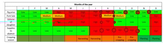 The seasonal calendar indicated that most of the pig-related diseases and syndromes (mange, worms, and diarrhea among others) occurred all the year round (Figure 4), whereas ASF appears to occur cyclically and prevails from November to the first quarter of the succeeding year. By consensus, mange, worms, diarrhea ranked the highest for occurrence, reiterating the earlier quantitative analysis in Table 2. The determinants of pig sale and random movements were the prevailing pig price (whole animal), pork sale, volume of slaughter, supply-demand dynamics to the abattoir and the cropping season. The period of high ASF prevalence, November to the following March, corresponded with periods of low pig price, pork sale (except in December), volume of slaughter and supplies to the abattoir (Figure 5). The months of April to August appear to be high seasons for all the indicators above and aligned with the harvesting seasons for most crop products (Figure 5).