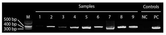 The PCR product on the agarose gel. The numbers on the lanes in the gel documentation (no. 1–9) correspond to (1) fetal fluid, (2) mesenteric lymph node, (3) abdominal fluid, (4) spleen 2, (5) spleen 1, (6) uterine fluid, (7) hepatic lymph node, (8) serum, and (9) whole blood. M is a DNA marker. NC is the negative control for master mix and PC is the ASF-positive control.