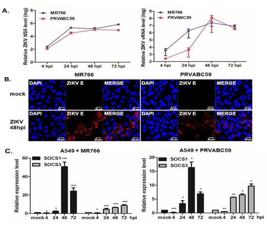 A549, JAr, and hNPCs were used to study the ZIKV-mediated innate immune response. A549 cells were infected at an multiplicity of infection (MOI) of 1, with either the African lineage (MR766) or Asian lineage (PRVABC59) of ZIKV. ZIKV NS5 and (-) vRNA transcript levels gradually increased in response to both MR766 and PRVABC59 infection in a time-dependent manner (Figure 1A); a finding which was consistent with our previous observation of efficient ZIKV replication in A549 cells []. The expression levels of ZIKV envelope (E) antigens increased in a time-dependent manner, and ZIKV E was visualized in most A549 cells at 48 h post-infection (hpi) by immunofluorescence staining (Figure 1B). The expression of SOCS1 and SOCS3 genes was quantified by qRT-PCR following MR766 or PRVABC59 infection. The suppression of both SOCS1 and SOCS3 transcript levels was observed at 4 hpi. SOCS1 transcript levels were significantly elevated upon ZIKV infection at 48 hpi, and decreased thereafter. In contrast, SOCS3 expression was upregulated following ZIKV infection at 24 hpi (Figure 1C). PRVABC59-infected A549 cells displayed similar patterns of gene expression.