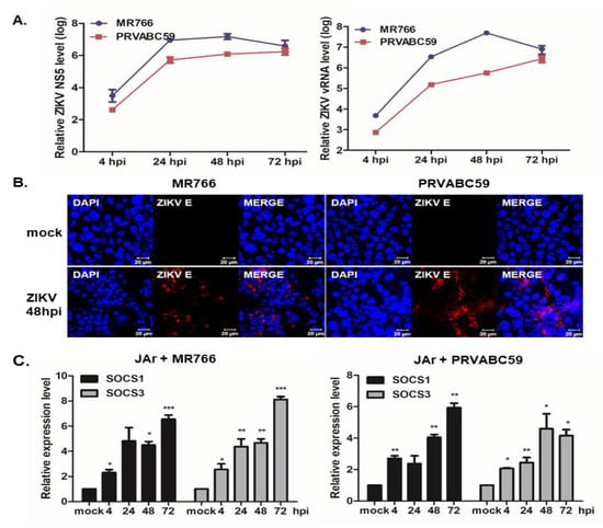Given that ZIKV infection during early pregnancy is known to target several human placental cells, including trophoblasts, endothelial cells, fibroblasts, and Hofbauer cells [,], the expression patterns of SOCS proteins during ZIKV infection were examined in JAr human choriocarcinoma cells. A significant dose-dependent upregulation of ZIKV NS5 and (-) vRNA transcript levels was observed in a time-dependent manner (Figure 2A). Additionally, immunofluorescence staining of ZIKV E proteins confirmed that JAr cells were susceptible to ZIKV infection (Figure 2B). The qRT-PCR results indicated a time-dependent elevation of SOCS1 and SOCS3 mRNA expression levels in response to both MR766 and PRVABC59 infections (Figure 2C).