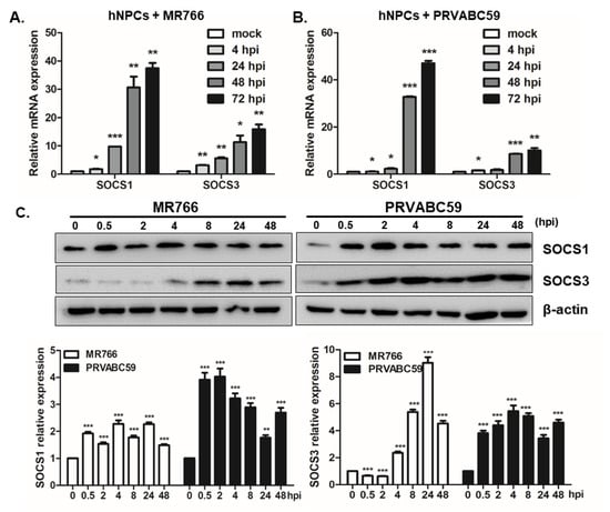 Previous studies utilizing various experimental models of congenital Zika syndrome identified neural progenitor cells as a primary target of viral infection []. Therefore, hNPCs were used to examine the expression pattern of SOCS following infection (MOI = 1) with the ZIKV African lineage (MR766) or Asian lineage (PRVABC59). As shown in Figure 3A, SOCS1 and SOCS3 expression increased at 4 hpi and continued to increase at later timepoints; a finding which indicates the early induction of SOCS expression subsequent to ZIKV infection. A further investigation was carried out to see if hNPCs display a distinct response to PRVABC59 infection. Similar patterns were observed in PRVABC59-infected hNPCs (Figure 3B). In addition, western blot results confirmed the upregulation of SOCS1 and SOCS3 protein levels triggered during the early phases of ZIKV infection (Figure 3C).
