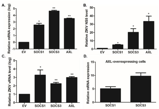 As ZIKV infection resulted in the upregulation of both SOCS1 and SOCS3 expression, SOCS1 or SOCS3 was overexpressed in A549 cells in order to further evaluate the functional roles of SOCS1 and SOCS3 in viral replication. Since AXL has been proposed as the entry receptor for ZIKV, AXL was used as a positive control []. qRT-PCR was utilized to determine the mRNA fold-induction levels of SOCS1, SOCS3, and AXL. The effect of SOCS1 and SOCS3 overexpression was validated in Figure 4A and the SOCS-mediated ZIKV replication efficiency was determined by measuring the transcript level of ZIKV NS5 or (-) vRNA. SOCS1 and SOCS3 overexpression resulted in a significant increase of ZIKV NS5 or (-) vRNA transcript levels (Figure 4B,C). Chen et al. indicated that AXL regulates the expression of SOCS1 in a STAT1/STAT2-dependent manner, thereby promoting ZIKV entry via antagonizing type I IFN signaling []. Therefore, we also measured the expression levels of SOCS1 and SOCS3 in AXL-overexpressing cells. Figure 4D shows increased SOCS1 and SOCS3 transcript levels following ZIKV infection AXL-overexpressing cells, compared with EV-transfected cells.