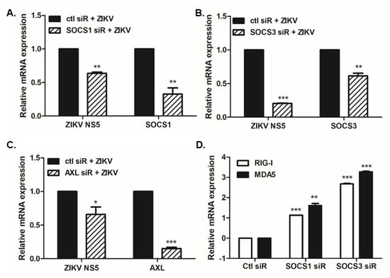 Next, to test the knockdown effect of SOCS proteins on ZIKV replication, cells were transfected with siRNAs specific to either SOCS1 or SOCS3. After 24 h, SOCS1 and SOCS3 mRNA levels were compared to control-transfected samples. qRT-PCR revealed effective SOCS1 and SOCS3 knockdown (Figure 5). The significantly reduced levels of ZIKV NS5 expression following SOCS1 and SOCS3 knockdown highlight the importance of SOCS expression for productive viral replication.