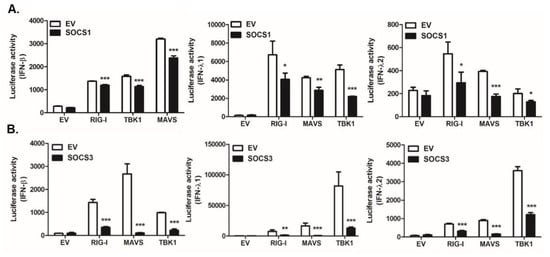 SOCS negatively regulates both type I and III interferon (IFN) pathways. HEK293T cells were transiently transfected with empty vector (EV), SOCS1 (A), or SOCS3 (B) co-transfected with the following plasmids: RIG-I, MAVS, or TBK1, along with IFN-β, IFN-λ1, and IFN-λ2 firefly luciferase reporter plasmids and the Renilla luciferase plasmid (internal control). The results are shown as the relative luciferase activity after normalization with Renilla luciferase activity. * p < 0.05; ** p < 0.01; *** p < 0.001 versus EV-transfected cells.