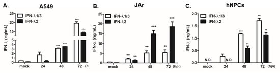 Type III IFN production is induced by ZIKV infection. A549 human lung adenocarcinoma cells (A), JAr human choriocarcinoma cells (B), and human neural progenitor cells (hNPCs) (C) were infected with ZIKV MR766 at an MOI of 1. The concentration of secreted IFN-λ1/3 and IFN-λ2 in cultured medium was determined by ELISA. * p < 0.05; ** p < 0.01; *** p < 0.001 versus mock-infected control cells.