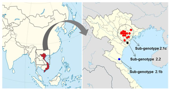 Map showing outbreaks of classical swine fever on pig farms in northern Vietnam. CSFV genotypes are denoted by the red circle (sub-genotype 2.1c), black circle (sub-genotype 2.2), and blue circle (sub-genotype 2.1b).