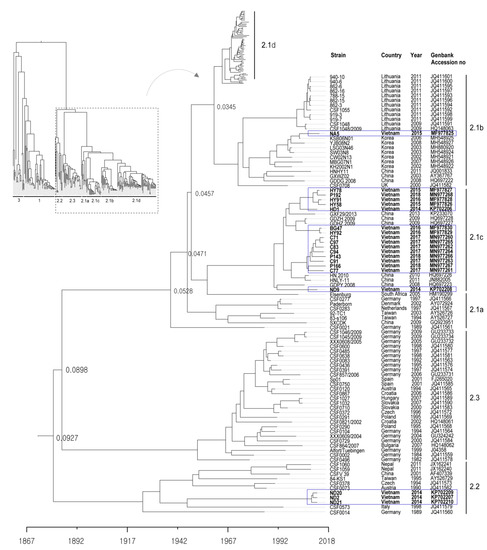 Phylogenetic tree based on the complete E2 sequences of Vietnamese CSFVs. The 171 complete E2 gene sequences, including those of 20 Vietnam strains, were obtained from the NCBI Genbank database. Each dataset was simulated using the following options: generation = 80,000,000; burn-in, 10%; and ESSs > 200. The confidence of the phylogentic analysis is represented by the numbers above the nodes representing branch length (time) based time scale by factor (1.0). Twenty Vietnamese strains are marked by blue boxes.