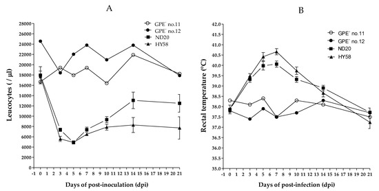 Leukocyte counts and rectal temperature of pigs inoculated with CSFV. Vietnamese strains inoculated group showed leukopenia and a high temperature. GPE− vaccine control group was shown individually and other Vietnam CSFV groups shown as mean standard ± deviation. White blood cell count (A) and rectal temperature (B) were measured for 21 days post-infection.