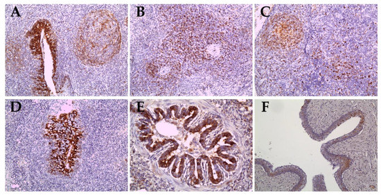 Immunohistochemical results in organs of pigs infected with the Vietnamese CSFV ND20 strain (A–C) and the HY58 strain (D–F). CSFV antigens were observed in the cryptal epithelium of the tonsils (A), infiltrated lymphocytes or macrophages of the spleen (B) and lymph nodes (C) of pigs with the ND20 strain (IHC; magnification × 200). Note CSFV antigens in the epithelial cells in the crypts of tonsil (D, IHC; × 200), the bronchiolar epithelium of the lung (E, IHC; × 400), and transitional epithelium of the urinary bladder (F, IHC; × 200) of pigs with the HY58 strain.