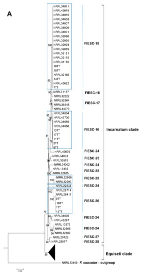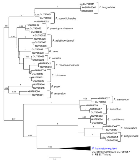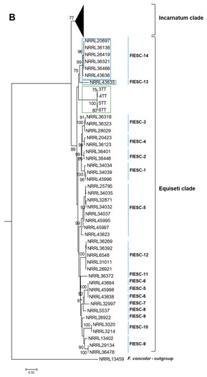 - Geiser, D.M.; del Mar Jiménez-Gasco, M.; Kang, S.; Makalowska, I.; Veeraraghavan, N.; Ward, T.J.; Zhang, N.; Kuldau, G.A.; O’Donnell, K. FUSARIUM-ID v. 1.0: A DNA sequence database for identifying Fusarium. Eur. J. Plant Pathol. 2004, 110, 473–479. [Google Scholar] [CrossRef]