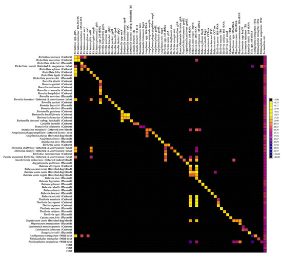 BioMarkTM dynamic array system specificity test (96.96 chip). Each square corresponds to a single real-time PCR reaction, where rows indicate the pathogen in the sample and columns represent the target of the primer/probe set. Ct values for each reaction are represented by a color gradient; the color scale is shown on the right y-axis. The darkest shades of blue and black squares are considered as negative reactions with Ct > 30.