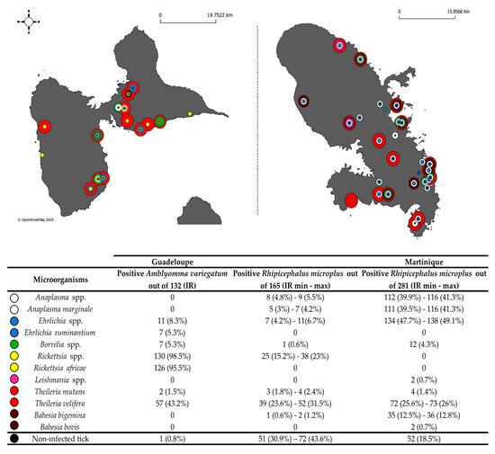 Infection rates in ticks collected in Guadeloupe and Martinique. Number of positive A. variegatum ticks (out of 132) and R. microplus ticks from Guadeloupe (out of 165) and Martinique (out of 281). On the maps, black dots indicate the collection sites of non-infected tick samples and colored dots indicate the collection sites of infected tick samples; The dot color determine the bacterial and parasitic genus of the microorganism found as indicated in the table; IR: Infection rate. As some R. microplus samples were pooled, we have presented minimum and maximum tick infection rates.