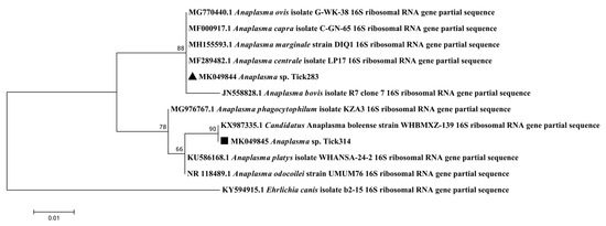 Phylogenetic analysis of 16S rRNA sequences of Anaplasma spp. Phylogenetic analysis of 16S rRNA sequences of Anaplasma spp. using the maximum likelihood method based on the Tamura–Nei model. In the phylogenetic tree, GenBank sequences, species designations and strain names are given. The sequences investigated in the present study are marked with a black triangle (Anaplasma sp. Tick283, accession number MK049844) and a black square (Anaplasma sp. Tick314, accession number MK049845). The tree with the highest log likelihood (−473.44) is shown. The percentage of trees in which the associated taxa clustered together is shown above the branches (bootstrap values). The analysis involved 12 nucleotide sequences. There were a total of 243 positions in the final dataset.