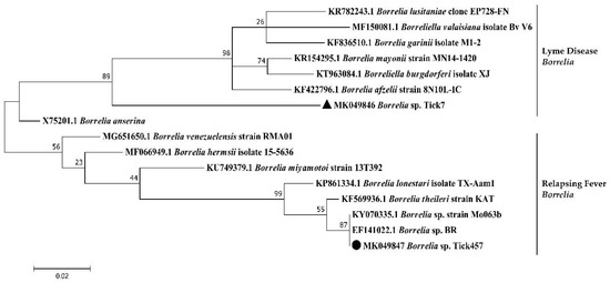Phylogenetic analysis of flaB sequences of Borrelia spp. Phylogenetic analysis of flaB sequences of Borrelia spp. using the maximum likelihood method based on the Tamura–Nei model. In the phylogenetic tree, GenBank sequences, species designations and strain names are given. The sequences investigated in the present study are marked with a black circle (Borrelia sp. Tick457, accession number MK049847) and a black triangle (Borrelia sp. Tick7, accession number MK049846). The Lyme disease and relapsing fever clades of Borrelia are marked. The tree with the highest log likelihood (−963.24) is shown. The percentage of trees in which the associated taxa clustered together is shown above the branches (bootstrap values). The analysis involved 16 nucleotide sequences. There was a total of 245 positions in the final dataset.