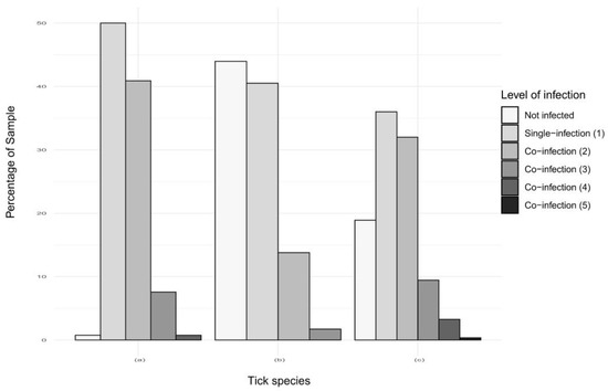 Co-infections detected in (a) Amblyomma variegatum (n = 132 samples) and (b) Rhipicephalus microplus collected in Guadeloupe (n = 116 samples) and (c) Rhipicephalus microplus collected in Martinique (n = 275 samples).