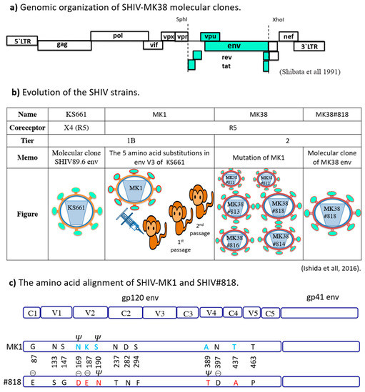 - Ishida, Y.; Kato, F.; Hishiki, T.; Matsuura, K.; Miura, T.; Watanabe, Y.; Yoneda, M.; Igarashi, T.; Matsushita, S.; Kikukawa, M.; et al. Generation of a neutralization-resistant CCR5 tropic simian/human immunodeficiency virus (SHIV-MK38) molecular clone, a derivative of SHIV-89.6. J. Gen. Virol. 2016, 97, 1249–1260. [Google Scholar] [CrossRef]