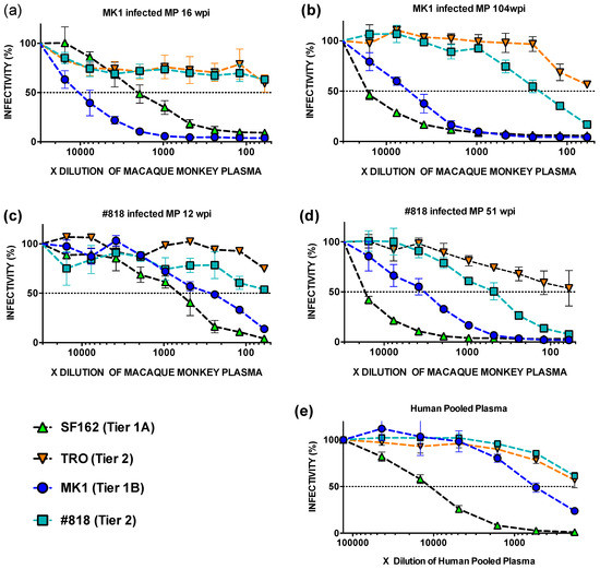 First, we sought to generalise the adaptation of HIV in humans to monkeys, because neither Ishida et al. nor Matsuda et al. examined the neutralisation resistance of SHIV-MK1 and SHIV#818 against SHIV-infected monkey plasma (MP) [5,6]. Therefore, we assessed whether MP represented HPP by comparing the neutralisation resistance of SHIV-MK1 (tier 1B), SHIV-MK38#818 (tier 2), and the control strains HIV-1 TRO (tier 2) and HIV-1 SF162 (tier 1A) with the TZM-bl assay.