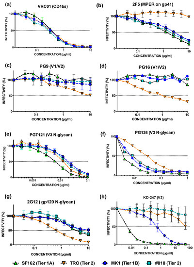 Figure 3. Analysis of the neutralisation resistance of each virus to eight anti-HIV-1 neutralising mAbs. After pre-incubating 100 TCID50 of each virus and each HIV-1-neutralising mAb, TZM-bl cells were cultured with the mixture for 48 h, after which the luciferase activity was measured. (a) MAb VRC01 recognizes the structure that includes CD4bs on gp120 [7]. VRC01 was diluted two-fold from 10 to 0.02 µg/mL. (b) 2F5 is a recombinant monoclonal antibody to HIV-1 gp41 [8]. 2F5 was diluted two-fold from 10 to 0.02 µg/mL. (c) PG9 is a recombinant, broadly neutralizing monoclonal antibody (bnMAb) to HIV-1 gp120, specifically to quaternary structure of V1V2 [9]. PG9 was diluted two-fold from 10 to 0.02 µg/mL. (d) PG16 is a recombinant, bnMAb to HIV-1 gp120, specifically to the quaternary structure of V2 [9]. PG16 was diluted two-fold from 10 to 0.02 µg/mL. (e) PGT 121 is a recombinant, bnMAb to HIV-1 gp120, specifically to the N332-centered oligomannose patch on the V3 loop [10]. PGT121 was diluted two-fold from 0.1 to 0.0002 µg/mL. (f) PGT126 is a recombinant, bnMAb to HIV-1 gp120, specifically to the N332-centered oligomannose patch of the V3 loop. PGT 126 was diluted two-fold from 1 to 0.002 µg/mL [10]. (g) 2G12 is a recombinant mAb to HIV-1 gp120. 2g12 contact with gp120 carbohydrates at glycosylation residues in C2, C3, C4, V3 and V4, gp120 [11,12]. 2G12 was diluted two-fold from 10 to 0.02 µg/mL. (h) KD-247 binds PGR epitope on V3 region and efficiently neutralizes CXCR4- and CCR5-tropic primary HIV-1 clade B including tier 2 JR-CSF virus [13]. KD247 was diluted three-fold from 50 to 0.001 µg/mL. - The IC50 of #818, MK, and SF162 against anti-HIV-1 gp41 mAb 2F5 was <3 µg mL−1, while the IC50 of TRO was > 10 µg mL−1 (Figure 3b). The neutralisation resistance to 2F5 is similar between MK and #818.