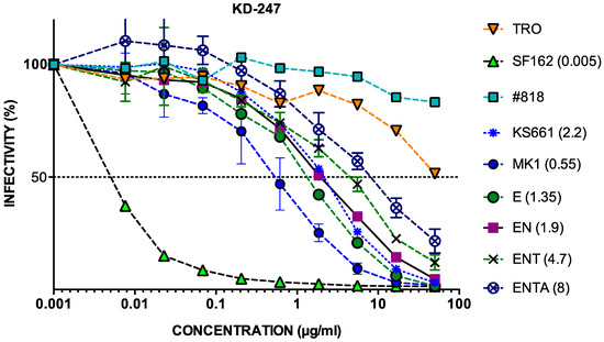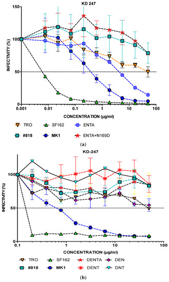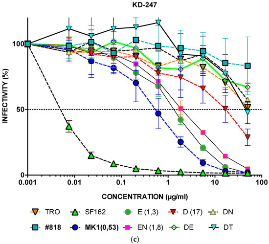 The IC50 values of #818, DENTA, DENT, DEN, DNT, DE, DN, and DT against KD247 were similar, and were all >50 µg mL−1 (Figure 5b,c). While the IC50 of MK1 was 0.5 µg mL−1, that of MK1+ N169D was 17 µg mL−1. The IC50 of MK1+169D indicated more than 34 times greater neutralisation resistance to KD247 compared to MK1 (Figure 5c).