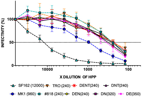 The ID50 values of DENT, DEN, #818, DNT, and TRO were 1:240 against HPP, while the ID50 of MK1 was 1:960, and those of DN and DE were 1:320 and 1:350, respectively (Figure 6).