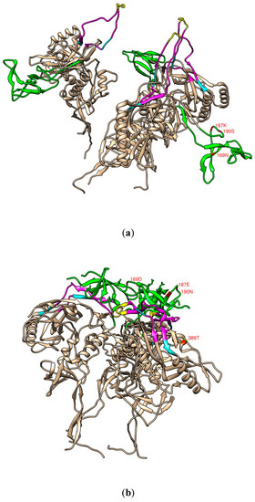 We found that the most important amino acid substitutions and epitopes of the mAbs of MK1 and #818 fit the tier 1 (Figure 8a) and tier 2 (Figure 8b) virus models visualised with UCSF Chimera software.