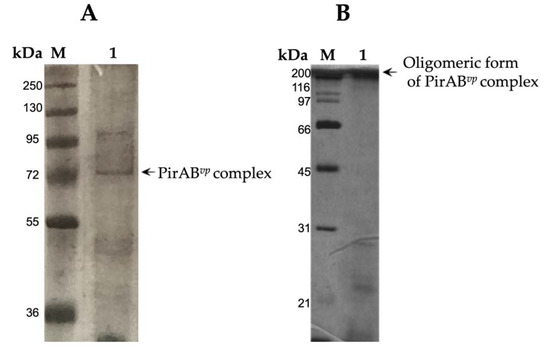 The PirABvp from ECPs of VpM0904 was identified and purified in a single step by affinity chromatography on glutaraldehyde-fixed stroma from rat erythrocytes (Figure 2A) or α-galactose-Sepharose (Figure 2B). The purified complex toxin with stroma had an apparent molecular weight of 70 kDa, which was not observed in the α-galactose affinity purification. The procedure using α-galactose-sepharose showed a 250 kDa band, which apparently corresponded to the tetrameric complex formed of four subunits of PirAvp (12 kDa for each one) and four subunits of PirBvp(50 kDa for each one).