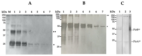 Both recombinant proteins were identified by SDS-PAGE using reducing conditions of each fraction obtained with different concentrations of imidazole (Figure 1). rPirAvp was identified in the dimeric (24 kDa) and tetrameric (48 kDa) forms, the dimeric form was the most abundant (Figure 3A) in non-reducing conditions. rPirBvp was identified as a 50 kDa monomer and probably as a 200–250 kDa tetra- or pentameric form under the same conditions (Figure 3B).