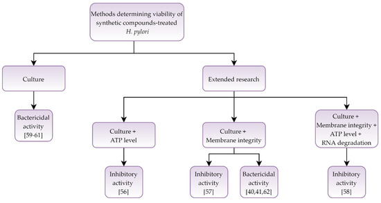 In a collection of nine articles [40,41,56,57,58,59,60,61,62] devoted to the activity and morphological effect of synthetic compounds against H. pylori, three of the tested compounds were reported as bacteriostatic [56,57,58] and five marked as bactericidal [40,41,60,61,62]. In one article, the effect on bacterial cells was dependent on the agent used [59]. Most articles (5 out of 9) used microscopy, culture, and fluorescence methods to determine the morphology and viability [40,41,56,57,62], while one study was expanded to include molecular methods [58] (Table 3 and Figure 3).