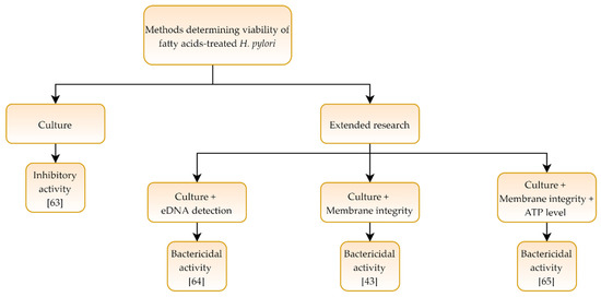 In four articles [43,63,64,65] determining the effect of fatty acids and fatty acid derivatives on H. pylori, one research used microscopy and culture methods demonstrating a bacteriostatic nature of the tested compound [63], while other three studies were expanded to include fluorescent or molecular methods, and here the activity of the compounds was interpreted as bactericidal [43,64,65] (Table 4 and Figure 4).