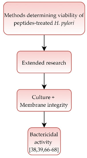 The last five articles [38,39,66,67,68] concerned an activity and morphological effect of peptides against H. pylori. In all, a bactericidal effect was suggested, while the action of peptides on bacteria was demonstrated using microscopy, culture, and fluorescent methods (Table 5 and Figure 5).