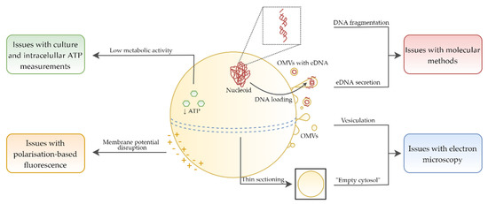 An additional aspect worth mentioning is the assessment of eDNA amount as an indicator of the cellular membrane permeability. Rossella et al. have shown that in a process of outer membrane vesicles (OMVs) secretion by H. pylori, eDNA is released (Figure 6) [86,87]. This, however, is a physiological process that can play an important role in the H. pylori survival. Protective function of eDNA is associated with a participation in a horizontal gene transfer [88,89] and the maintenance of biofilm stability [86]. In addition, it has been suggested that the release of OMVs during transformation of H. pylori from a spiral to a coccoid form is associated with a reduction in cell size [24]. The similar process was also detected in VBNC Vibrio parahaemolyticus cells and was related to a starvation-dependent reduction in metabolic activity [90].