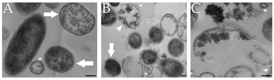Representative photos of H. pylori cells taken with transmission electron microscopy (TEM). (A) Mixed population of spiral/rod-shaped and coccoid cells. (B) Population of coccoid cells in different physiological states. (C) Coccoid cell after degradation (cell lysis). Symbols: coccoid form with dense cytosol (white arrow), coccoid form with “empty cytosol” (empty arrow), irregularly- shaped coccoid form (white arrowhead), outer membrane vesicles (white stars). Scale bar is equal to 0.2 µm.