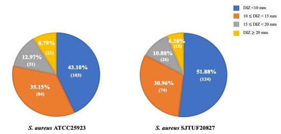 Screening of 239 TCMP extracts for antibacterial activities against S. aureus ATCC 25923 (reference strain) and SJTUF 20827 (antibiotic-resistant strain). Number in parentheses indicates the number of TCMP extracts, which exhibited DIZ value in four different ranges of DIZ value; DIZ < 10 mm, 10 ≤ DIZ < 15 mm, 15 ≤ DIZ < 20 mm and DIZ ≥ 20 mm.