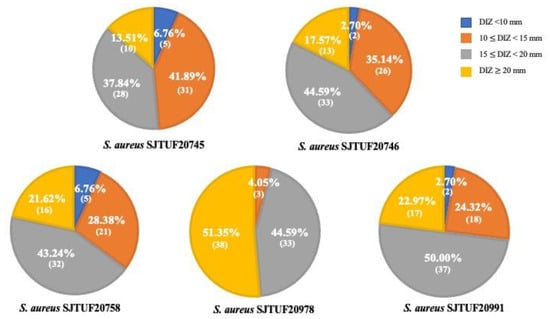 Based on initial screening results in which both the reference and antibiotic-resistant S. aureus model strains were found to be susceptible to TCMP extracts, we selected 74 strong TCMP extracts (DIZ ≥ 15 mm) and proceeded to the assessment of the wide range of antibacterial activities against multidrug-resistant S. aureus strains SJTUF 20745, 20746, 20758, 20978, and 20991 (Table 1). In this study, results showed that the selected TCMP extracts exhibited different antibacterial effects against multidrug-resistant pathogens; however, most extracts revealed strong and extensive antibacterial activities. As shown in Figure 2, 51.35%, 62.16%, 64.86%, 95.94%, and 77.97% of TCMP extracts possessed strong inhibitory effects (DIZ ≥ 15 mm) against S. aureus SJTUF 20745, 20746, 20758, 20978, and 20991, respectively.