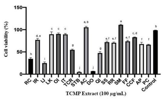 The cytotoxicity of 18 TCMP ethanolic extracts on human foreskin fibroblast (HFF) cells, which are human normal cells, was determined by the colorimetric assay using 3-(4,5)-dimethylthiazol-2-yl)-2,5-diphenyltetrazolium bromide (MTT) as described by Senthilraja and Kathiresan [82] with slight modification. Briefly, cells/mL were cultured with Dulbecco’s modified Eagle’s medium (DMEM) supplemented with 10% fetal bovine serum into each well of 96-well microplates and incubated at 37 °C in a humidified 5% CO2 incubator overnight. The cells were treated with various concentrations (ranging from 1.56 to 100 µg/mL) of TCMP extracts and incubated at 37 °C for 24 h, whereas the untreated cells were used as control. Next, cells in each well were treated with 100 µL MTT (5 mg/mL, in PBS) and were maintained for 3 h at 37 °C in the dark. After removal of MTT solution, 100 µL DMSO was added to dissolve insoluble formazan crystal. The absorbance was measured at 570 nm by a microplate reader (SpectraMax iD3, Molecular Devices, Silicon Valley, NC, USA). This assay was conducted in triplicate in four independent experiments. The percentage of cell viability was calculated based on the following equation: