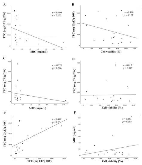 Pearson correlation analysis. (A) Correlation of total phenolic content (TPC) with minimum inhibitory concentration (MIC). (B) Correlation of TPC with cell viability (%) at 100 µg/mL. (C) Correlation of total flavonoid content (TFC) with MIC. (D) Correlation of TFC with cell viability (%). (E) Correlation of TPC with TFC. (F) Correlation of MIC with cell viability (%).