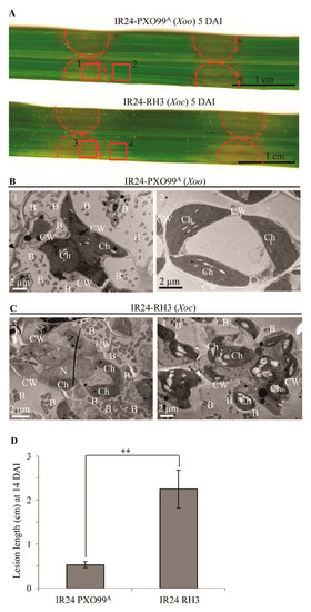 Figure 1. Xoo only multiplied around mesophyll cells at inoculation site, but Xoc spread through mesophyll cells. DAI, days after inoculation; B, Xoo or Xoc bacterium; Ch, Chloroplast; CW, cell wall; N, nucleus; The inside area of dotted red arc, the area of inoculation site; Red square frame 1 and 3, inoculation site; Red square frame 2 and 4, non-inoculation site. (A) Leaf response of susceptible rice IR24 inoculated Xoo strain PXO99A and Xoc strain RH3. (B,C) Ultrastructural feature of mesophyll cells in inoculation sites (1,3) and non-inoculation sites (2,4). (D) Lesion length of IR24 infected with Xoo strain PXO99A and Xoc RH3 at 14 DAI. Bar represent mean (5 to 12 leaves from three plants) ± standard deviation (SD). Double asterisks (**) stand for the significant difference between IR24 inoculated with RH3 and IR24 inoculated with PXO99A at p < 0.01.