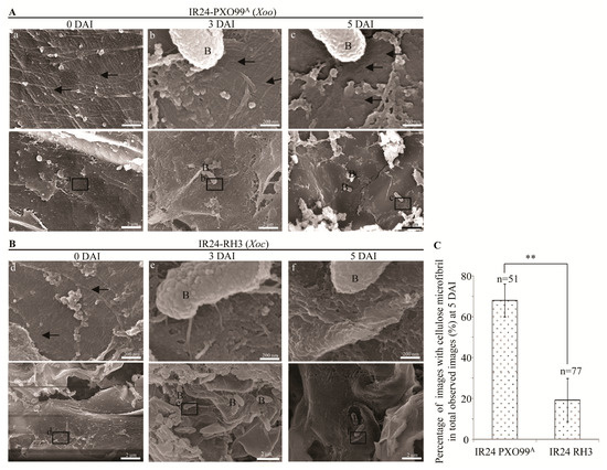 Figure 2. The intact cell wall of mesophyll cells in rice infected with Xoo, but the broken cell wall in rice infected with Xoc. B, bacterium; black arrow, cellulose microfibril. (A) The intact surface structures of cell wall in mesophyll cells of rice leaves inoculated with Xoo strain PXO99A represented by low magnification images (down) and high magnification images (upper) at 0, 3, and 5 day after inoculation (DAI). (B) The broken surface structures of cell wall in mesophyll cells of rice leaves infected with Xoc strain RH3 at 3 and 5 DAI in comparison with plants at 0 DAI represented by low magnification images (down) and high magnification images (upper). (C) The percentage of images with cellulose microfibril in total observed high magnification images from six different plants at 5 DAI. Data represent mean (at least six mesophyll cells were observed from six different plants in two independent inoculation) ± standard deviation (SD). Double asterisks (**) stand for the significant difference between percentage of image with cellulose microfibril in rice inoculated with PXO99A and percentage of image with cellulose microfibril in rice inoculated with RH3 at p < 0.01. n, the total number of observed high magnification images.