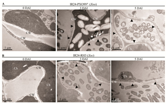 Under transmission electron microscopy (TEM) analyzing rice mesophyll cells, the normal cell wall represented low electron-density (transparent) layer structure; the cell wall broken by pathogens represented high electron-density (opaque) layer structure because of osmiophilic material deposition in cell wall [22,23]. To further investigate the cell wall inner structure, we observed the cell wall of the mesophyll cell in susceptible rice IR24 inoculated by Xoo strain PXO99A and Xoc strain RH3 under TEM. There was slightly higher electron density of cell wall (shown by black arrow head) and distinct layers of cell wall in mesophyll cells of leaves inoculated with Xoo at 3, 5 DAI in comparison with the electron-density of cell wall at 0 DAI (Figure 3A). However, there was dramatically higher electron-density of cell wall (black arrow head) and non-layers of cell wall in mesophyll cells of leaves inoculated with Xoc at 3, 5 DAI in comparison with the electron density of cell wall at 0 DAI (Figure 3B). At the same time, the out layer of the cell wall contacting with the bacterium consisted of many electron-dense (osmiophilic) particles in mesophyll cell of leaves inoculated with Xoc at 3 DAI (Figure 3B). Cellulose as the major component of plant cell wall is synthesized by cellulose synthase genes (CESA) [21]. To further analyze the cell wall inner structure, we found that the relative expression levels of CESA4/7/9 significantly reduced in IR24 rice leaves inoculated both with Xoo strain PXO99A and with Xoc strain RH3 (Supplementary Figure S2). However, the expression of CESA4/7/9 in rice leaves inoculated by Xoc were significantly (p < 0.01 and p < 0.05) induced to lower levels than in rice leaves inoculated by Xoo at 2, 4, 12, and 24 hours after inoculation (Supplementary Figure S2).