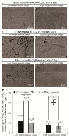 Figure 4. In vitro lower degradation ability of Xoo than that of Xoc. (A) The fibers densely packing and few interstitial cavities between microfibrils on surface of filter paper treated by Xoo strain PXO99A at the 5th day. (B) Many interstitial cavities between big fibers and microfibrils on surface of filter paper treated by Xoc strain RH3 at the 5th day. (C) The fibers densely packing and few interstitial cavities between microfibrils on surface of filter paper treated by H2O (negative control) at the 5th day. (D) The percentage of image with interstitial cavity between fibers in total observed images from filter papers treated by Xoo strain PXO99A, Xoc strain RH3 and H2O at the 5th day. Data represent mean (at least three images were observed from three different filter papers) ± standard deviation (SD). Double asterisk (**) stand for the significant differences between percentage of images with interstitial cavities among fibers or microfibrils between infilter paper treated by PXO99A and infilter paper treated by RH3, between infilter paper treated by RH3 and infilter paper treated by H2O (negative control) at p < 0.01. n, the total number of observed images.