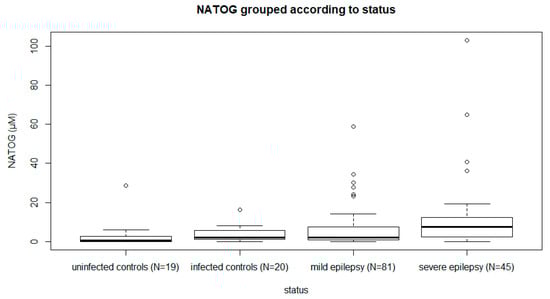 A total of 134 PWE with a positive skin snip and/or a positive OV16 RDT participated in the study. Of those, 117 (87%) had active O. volvulus infection. Their median age was 24 years, and 68 (53.5%) of them were male. The median mf density of the PWE was 10 mf/skin snip (IQR: 0–59), and the median urinary NATOG concentration was 3.67 µM (IQR: 1.24–8.55). The median seizure frequency was two seizures per month (IQR: 0–4). The median urinary NATOG concentration was higher in PWE (3.67 µM (IQR: 1.24–8.55)) compared to men without epilepsy (1.74 µM (IQR: 0.00–3.14), median test p = 0.017) and higher in persons with severe epilepsy (7.62 µM (IQR: 2.52–15.5)) compared to those with mild epilepsy (2.17 µM (IQR: 1.00–7.59), median test p = 0.008) (Table 1, Figure 1). Similarly, the median mf density was higher (19.5 mf/skin snip (IQR: 2–84)) in persons with severe epilepsy compared to persons with mild epilepsy (5 mf/skin snip (IQR: 0–40), median test p = 0.041) and a higher proportion of persons with severe epilepsy (82%) had active O. volvulus infection compared to persons with mild epilepsy (67%, chi-square p = 0.029).